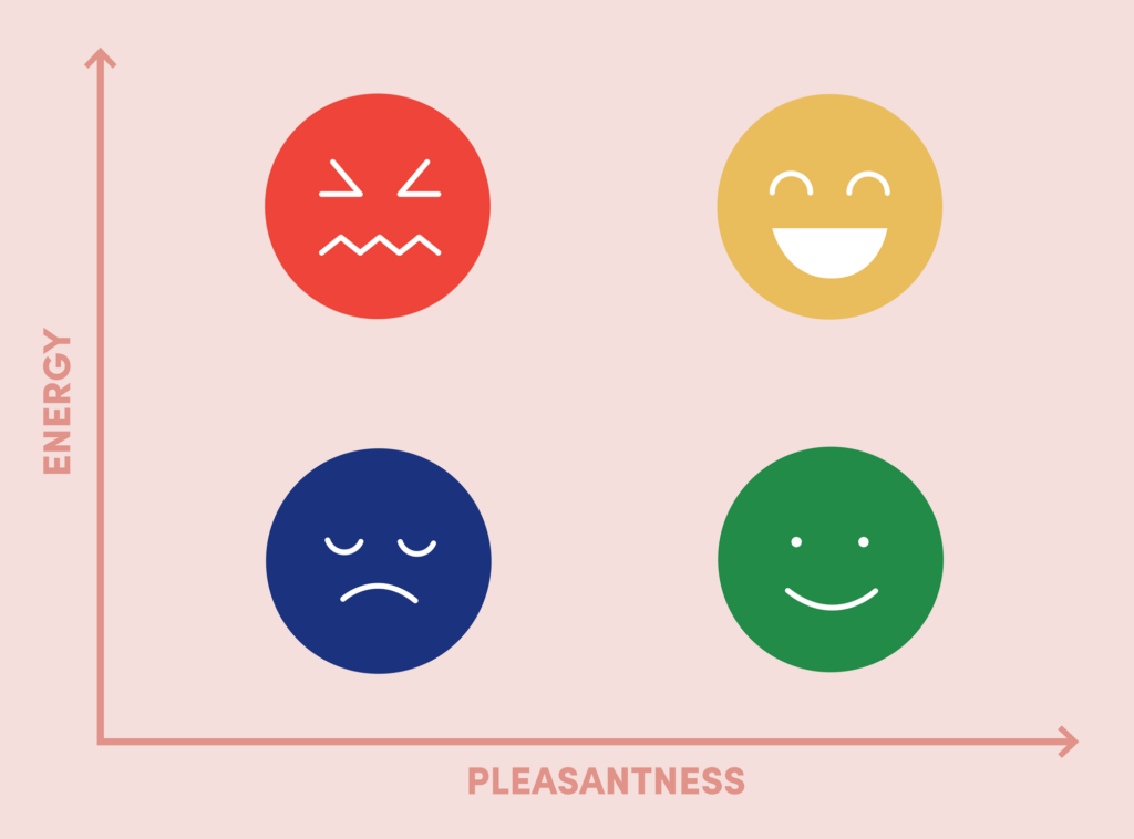 The mood meter is a tool that helps you plot how you feel as a product of two dimensions: pleasantness and energy. If you’re high pleasant, high energy, you’re in the yellow—the generally happy emotions. If you’re high pleasant but low in energy, you’re in the green—chilled out. If you’re unpleasant with a lot of energy, you’re in the red—the angry emotions. And if you’re unpleasant with a little bit of energy, you’re in the blue—sad.